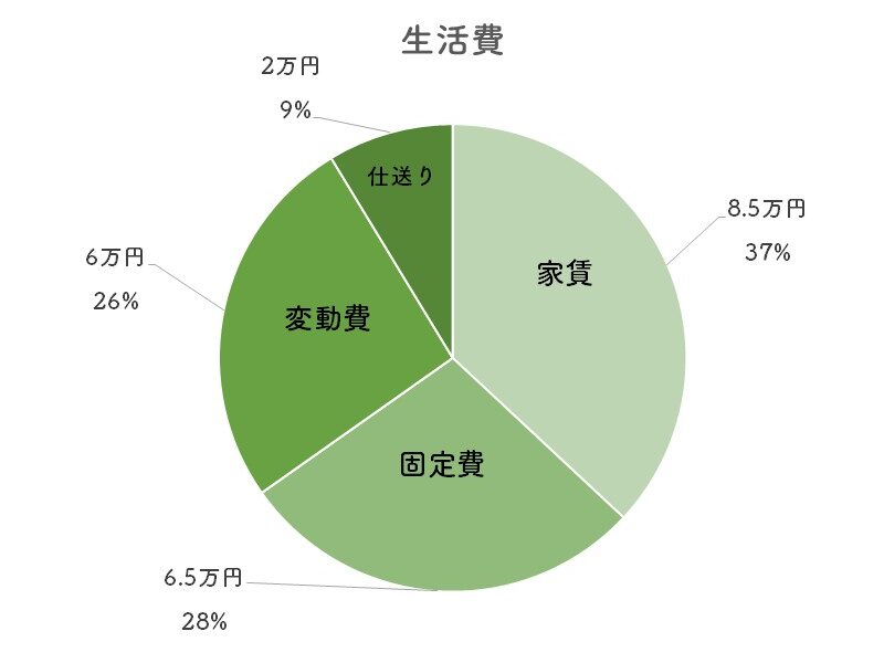 ◎固定費 …… 6.5万円 + 家賃8.5万円 + 実家への仕送り2万円